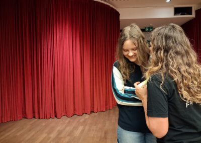 Auch die Parallelgruppe wurde beim Interpretieren von spanischen Popsongs aktiv und vertonte „Me gustas tú“ neu. Nach der Pause fertigten die Teilnehmer:innen unter spanischer Anleitung kleine Kunstwerke der Cyanotypie an. Die Stimmung war gut, unsere Schüler:innen beteiligten sich aktiv und durch den Kontakt mit